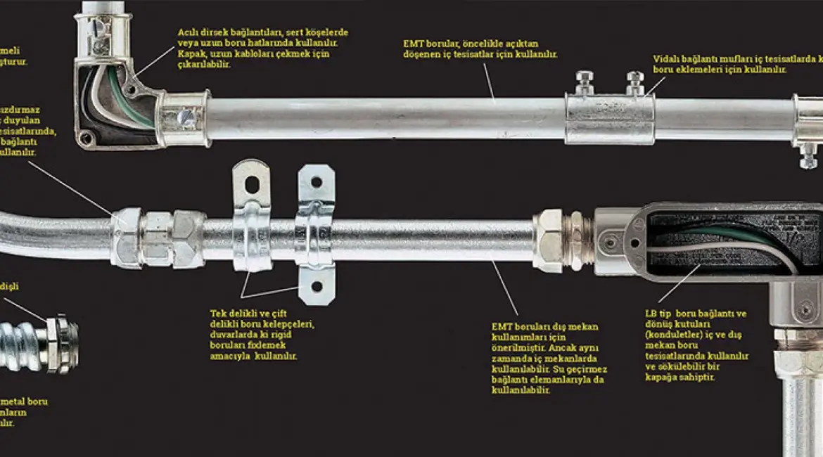 - EMT borular, öncelikle açıktan döşenen iç tesisatlar için kullanılır.
